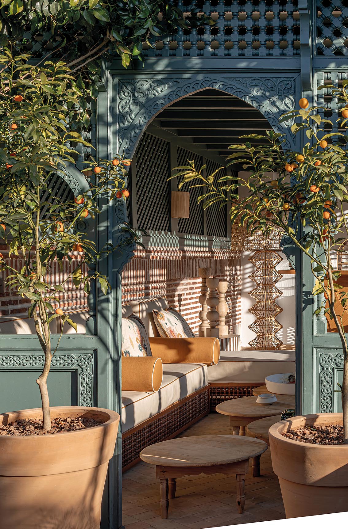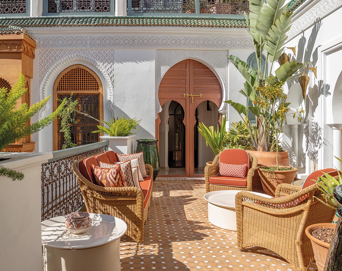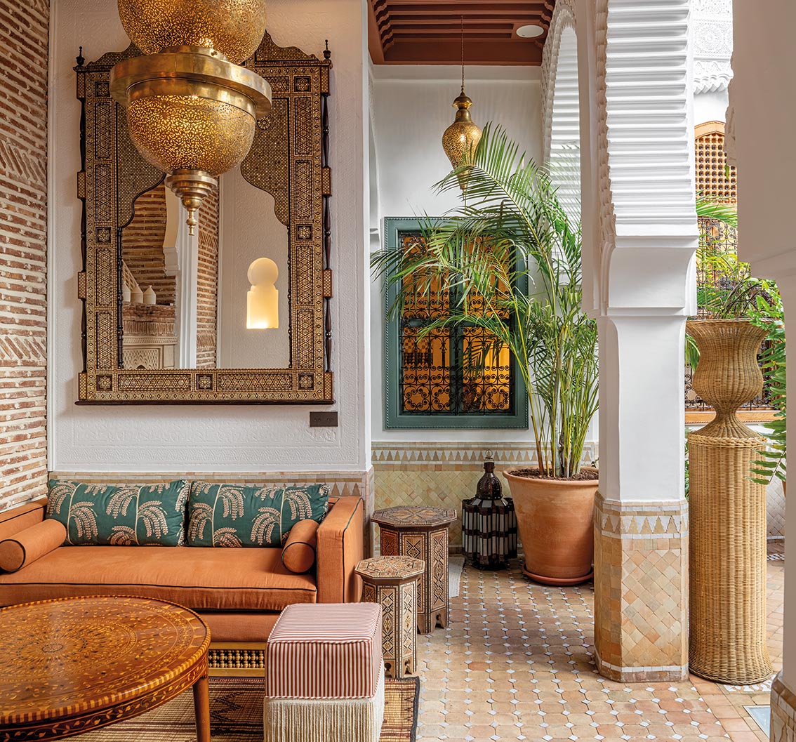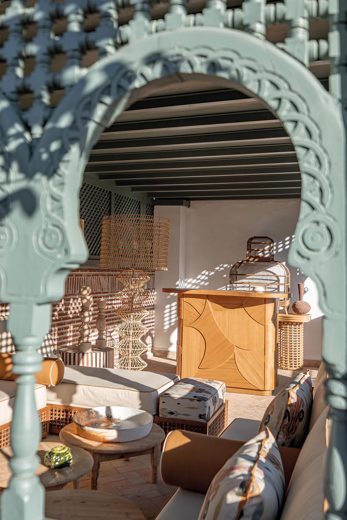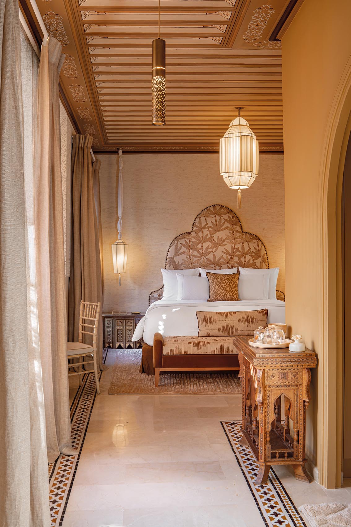 Arches, têtes de lit et moucharabiehs réinterprètent l’architecture arabisante, associés à un mobilier artisanal et des matières naturelles.