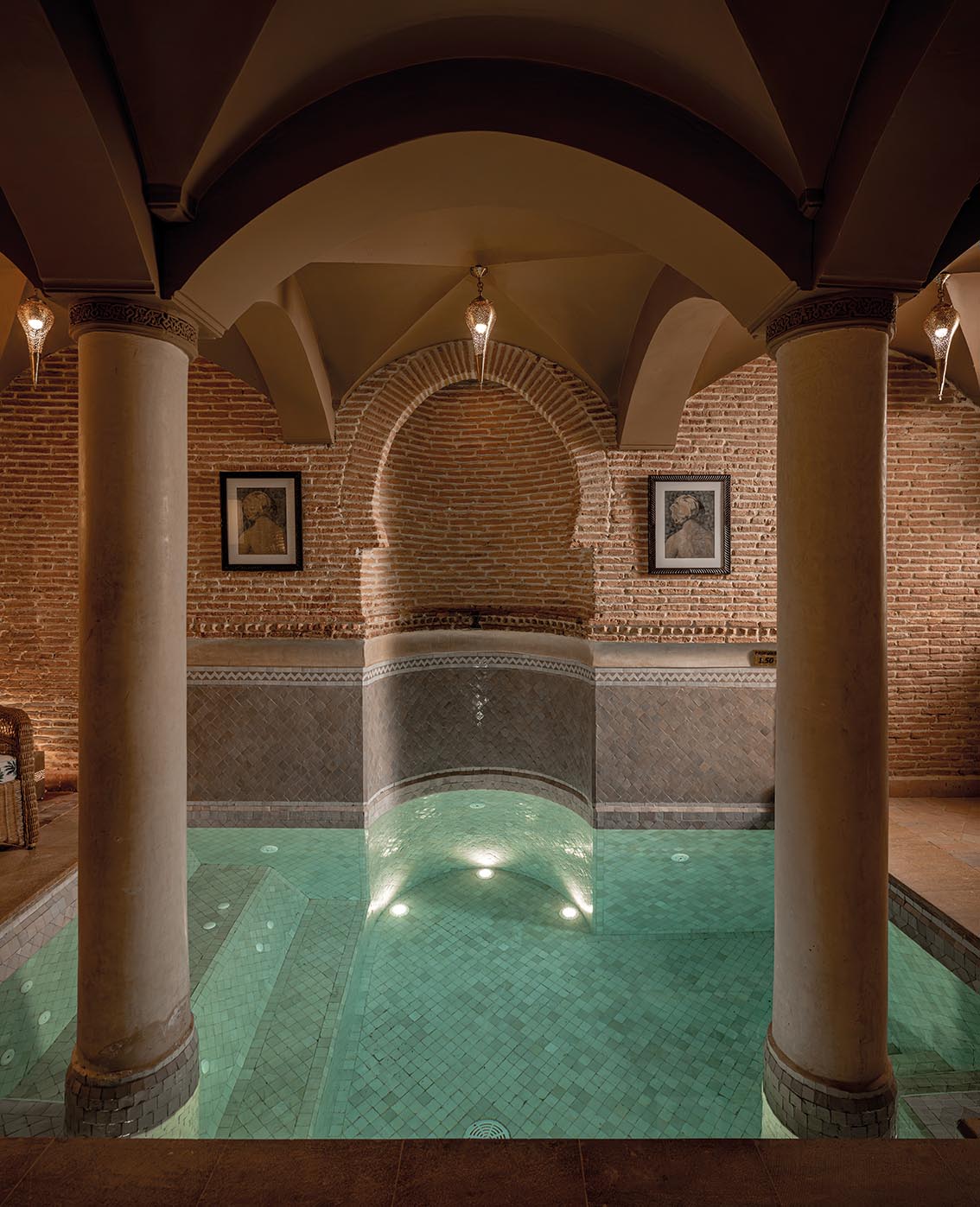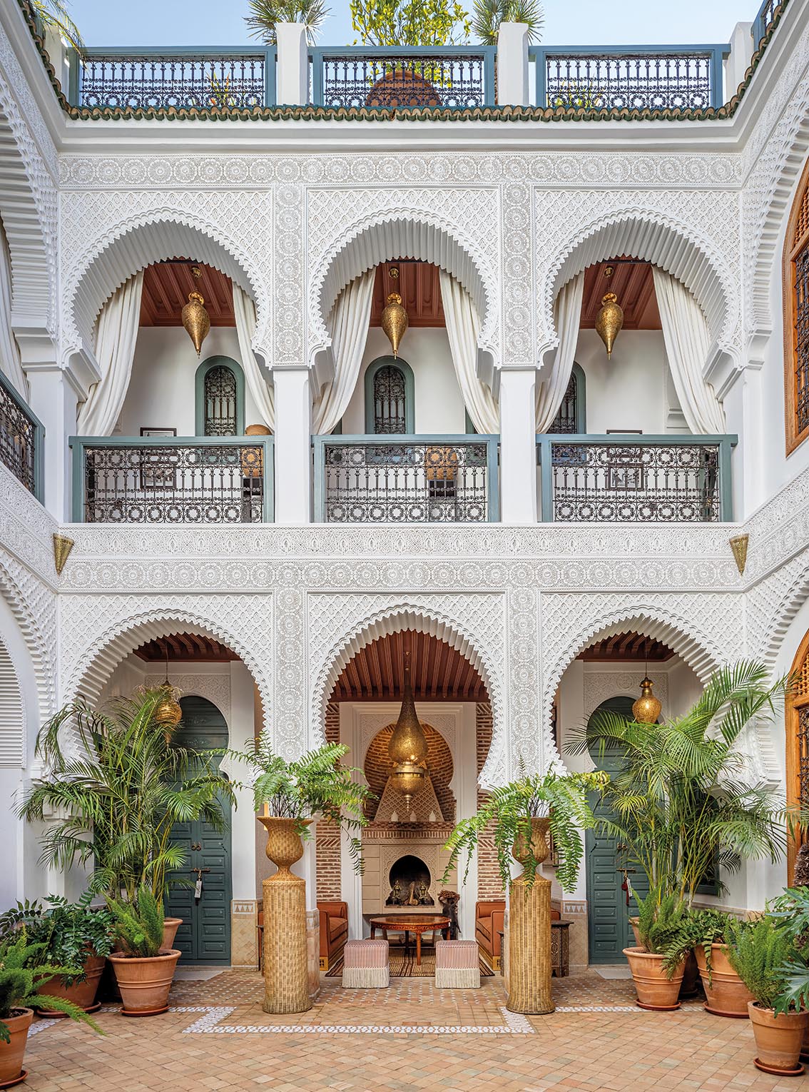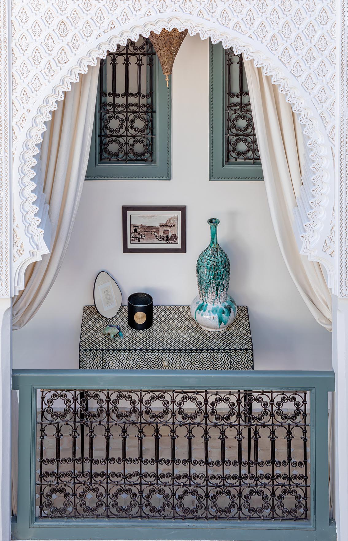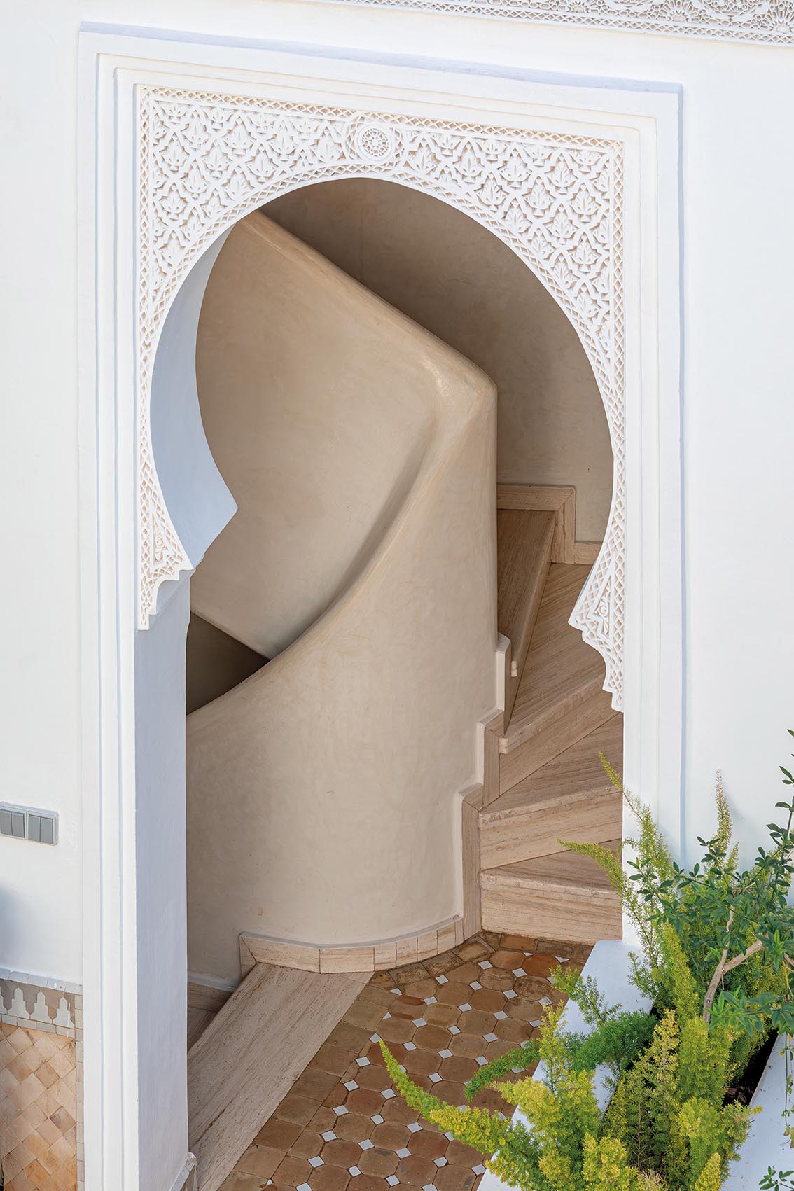 L’architecture, déjà équilibrée, est ici révélée plutôt que transformée. Certaines arches sont subtilement enrichies de stuc, comme une dentelle, réintroduisant la finesse de l’artisanat marocain.