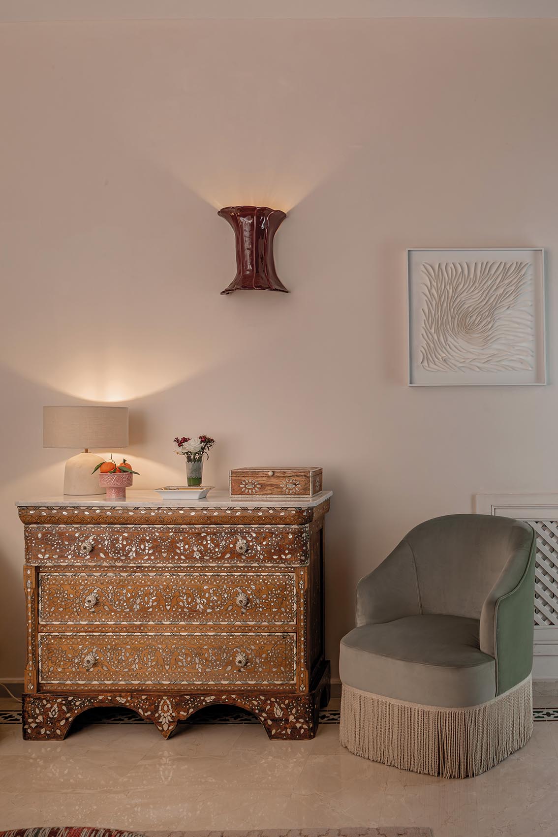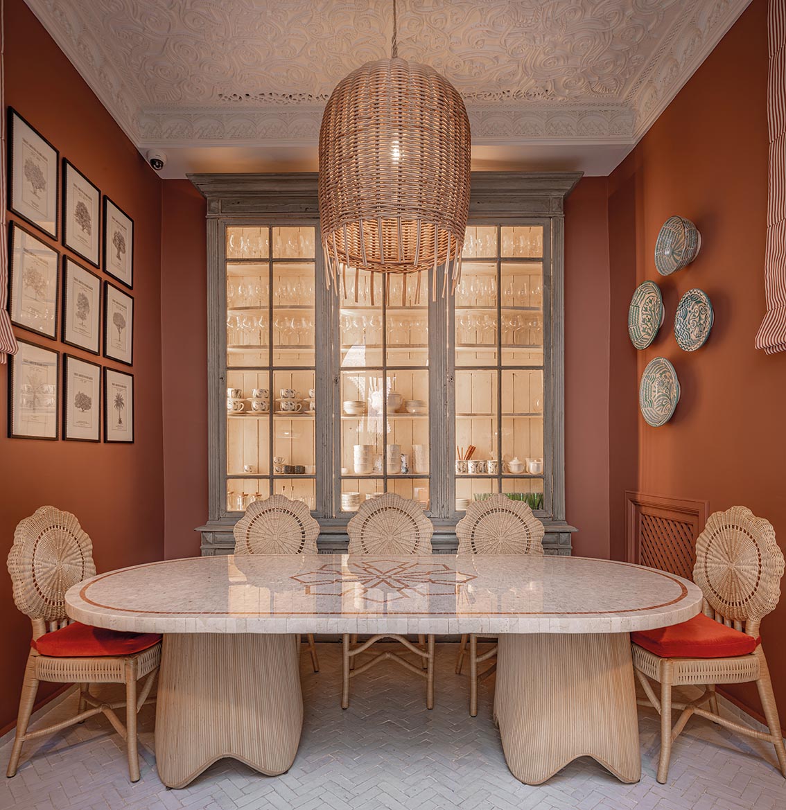 Bois, textile, pierre et métal dialoguent avec justesse, tandis que jeux d’ombres et moucharabiehs installent une atmosphère feutrée, où chaque détail révèle l’âme du lieu.