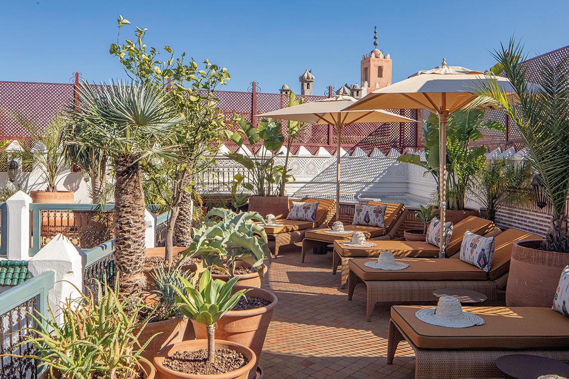 Sur le rooftop, le riad s’ouvre au ciel et change de rythme. Pensé comme un espace de vie, il propose une lecture plus libre et lumineuse du projet.