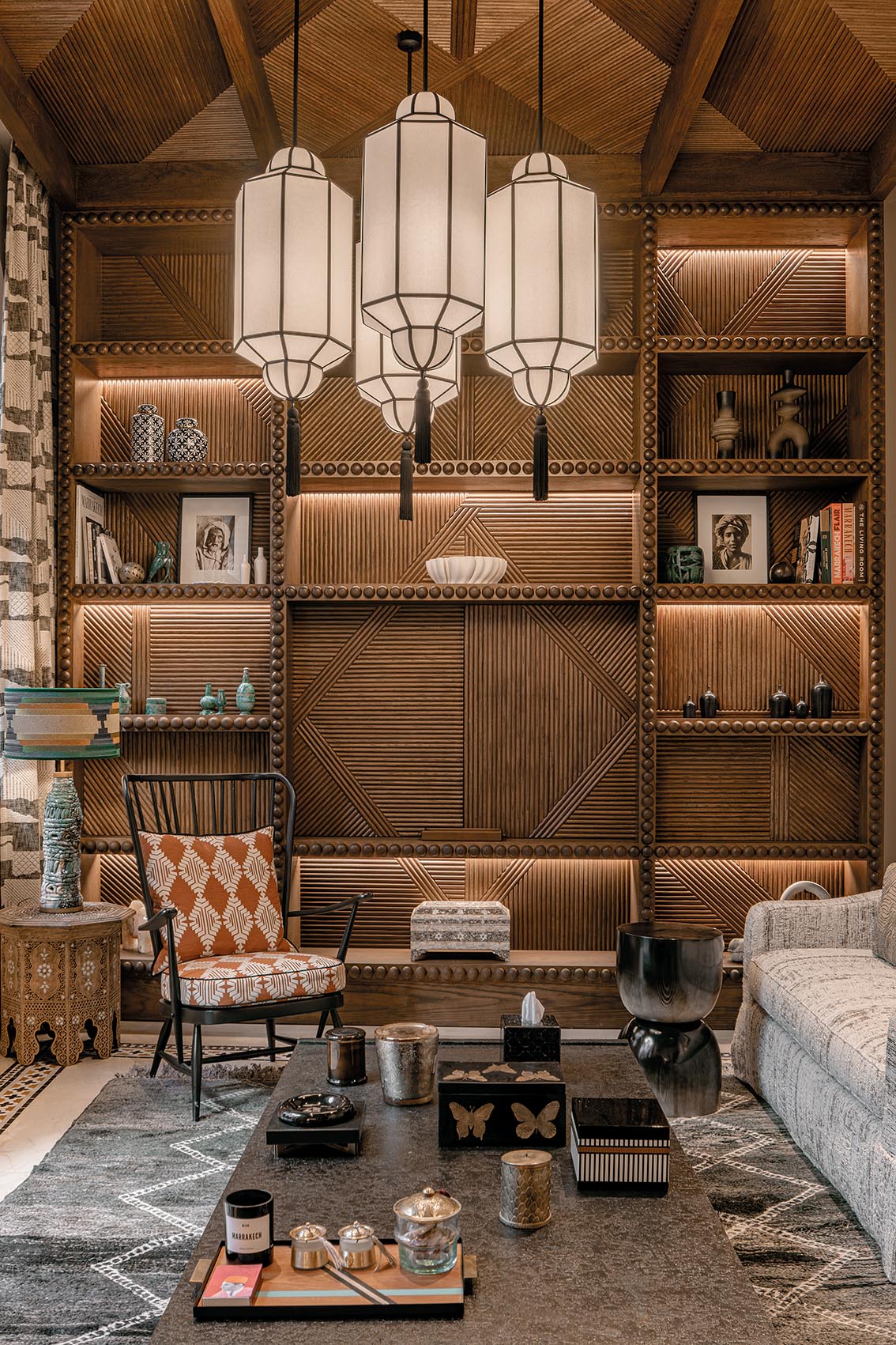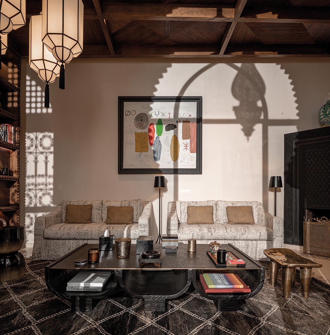 Plafond, bibliothèque sculptée et rideaux chez Maison Nicole Intérieur. Suspensions chez Henry Cath. Lampe à poser chez Riad El Fenn. Tapis chez Soufiane Zarib