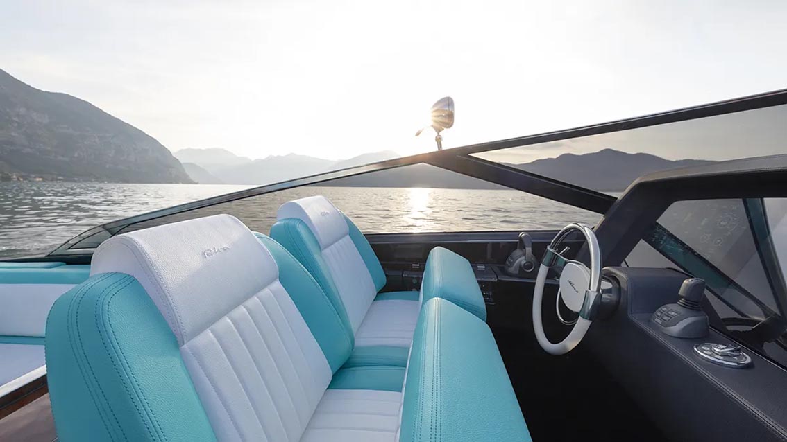 Présenté au Cannes Yachting Festival, le Riva Cento conserve la silhouette fluide et brillante qui a fait la renommée du Rivamare. Pont en acajou verni, lignes tendues, détails en acier poli : rien ne trahit l’héritage. Et pourtant, tout a été affiné. La coque se pare d’un noir métallisé inédit, les finitions intérieures empruntent aux codes automobiles vintage — dans des tons biscuit, aquamarine ou blanc — et des détails comme la corne de brume ou l’insert latéral en acajou rendent hommage aux modèles d’antan.