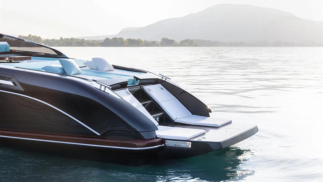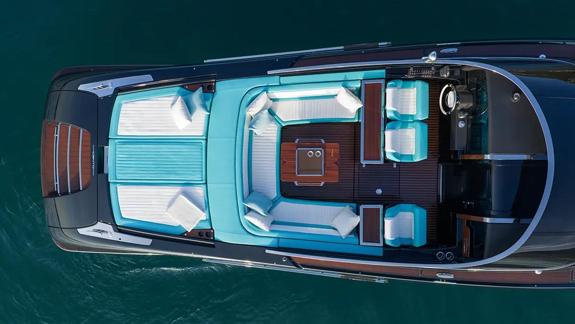 Mais le Cento va plus loin. À l’arrière, une plateforme électro-hydraulique dévoile un mini beach club avec bains de soleil, rangements et passerelle intégrée. À l’avant, un cockpit modulable se transforme en salon marin abrité. Entre les deux, un espace bar pensé pour la convivialité, le tout piloté par une technologie de pointe (écrans Boening, joystick Volvo Penta).