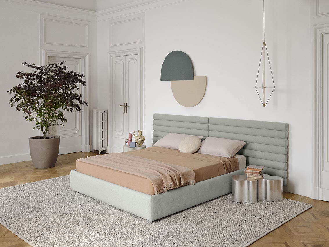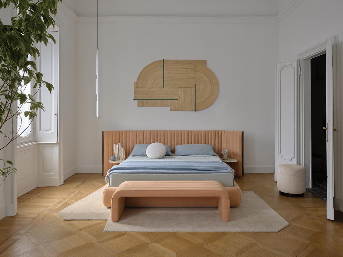 Ici, la tête de lit devient le cœur du design : matelassée, souple, malléable, elle se transforme d’un simple geste. Ouverte, elle dévoile une allure graphique et aérienne ; refermée, elle crée un cocon protecteur et intime. Un jeu d’équilibre entre géométrie et douceur, entre rigueur architecturale et sensualité des formes.