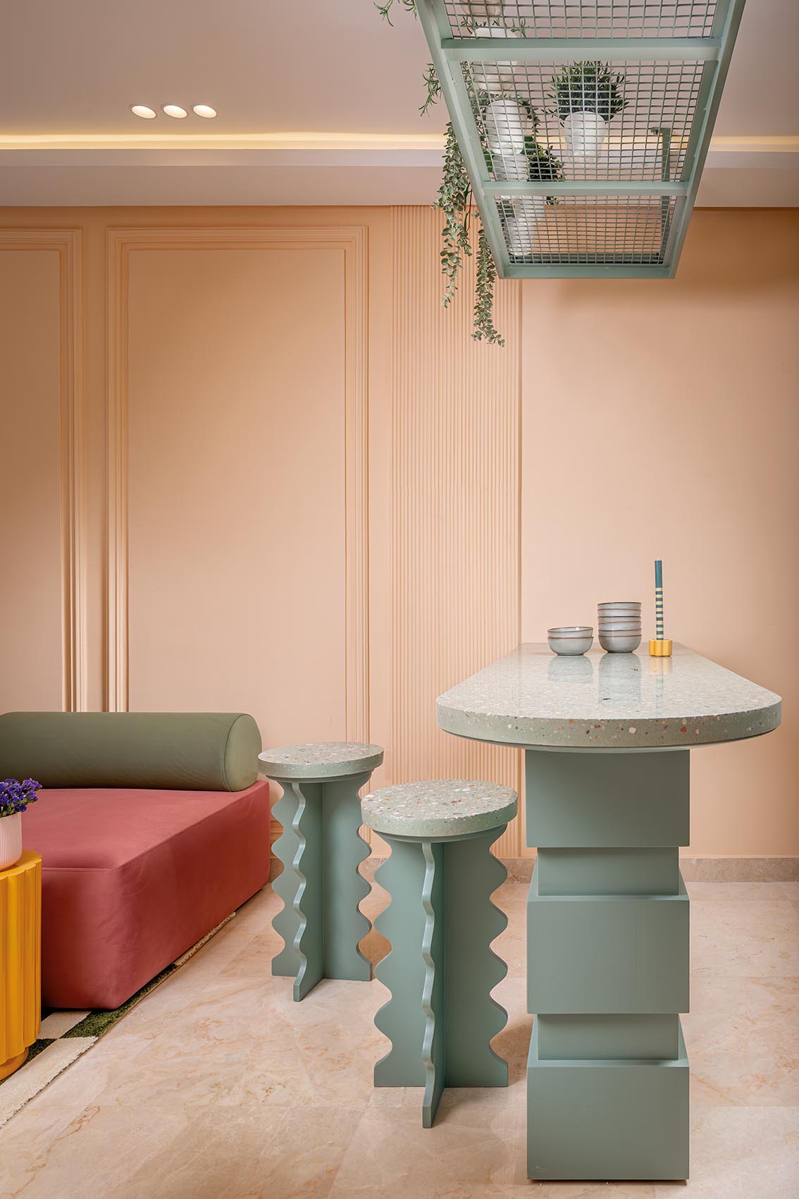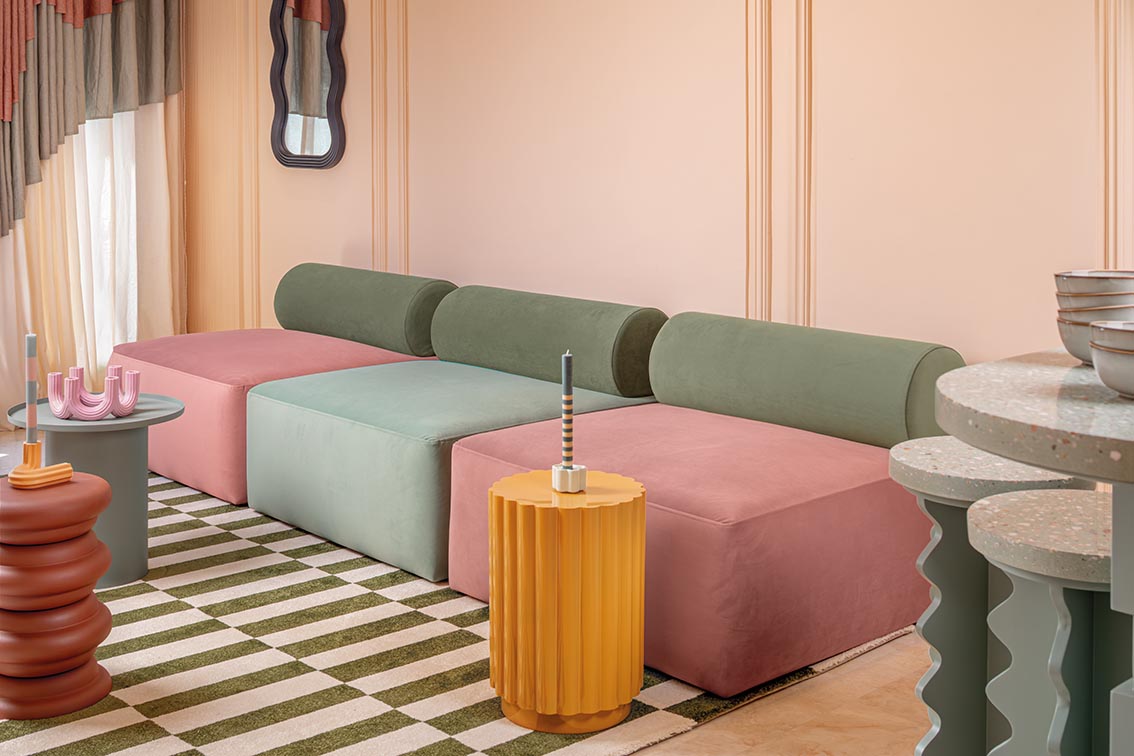 Lys est pensé comme un intérieur compact, rythmé par une palette assumée où le rose, le vert et les touches de beige structurent l’ensemble. Signé Bismark Studio, l’espace repose sur une lecture fluide : chaque volume est dessiné pour optimiser la circulation et créer un langage visuel cohérent.