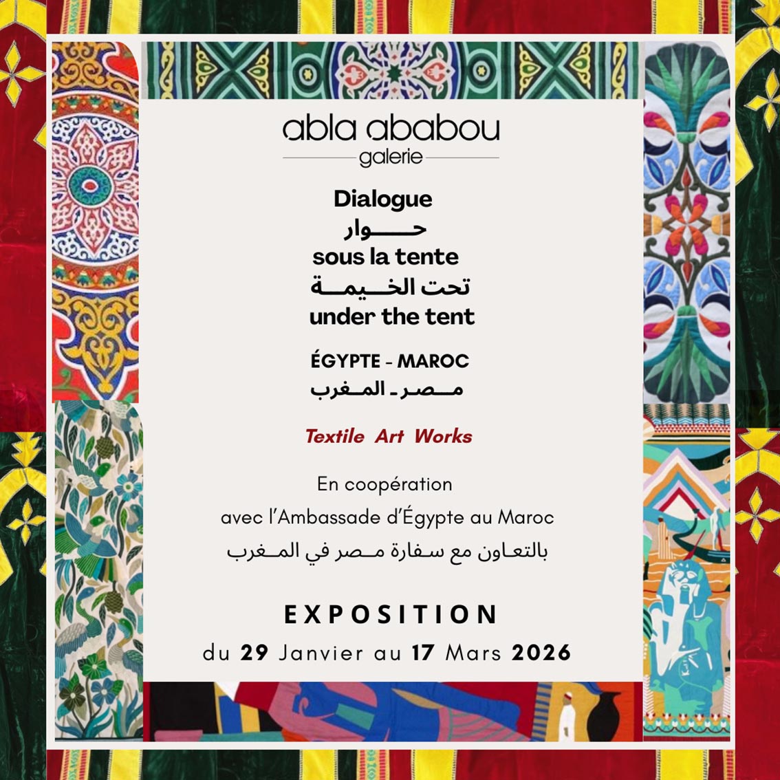 Du 29 janvier au 17 mars 2026, la Galerie Abla Ababou à Rabat accueille Dialogue sous la tente, une exposition collective organisée avec l’Ambassade d’Égypte au Maroc. Cette rencontre artistique et culturelle met en lumière la tente comme espace de transmission et de création partagée entre les traditions marocaines et égyptiennes.