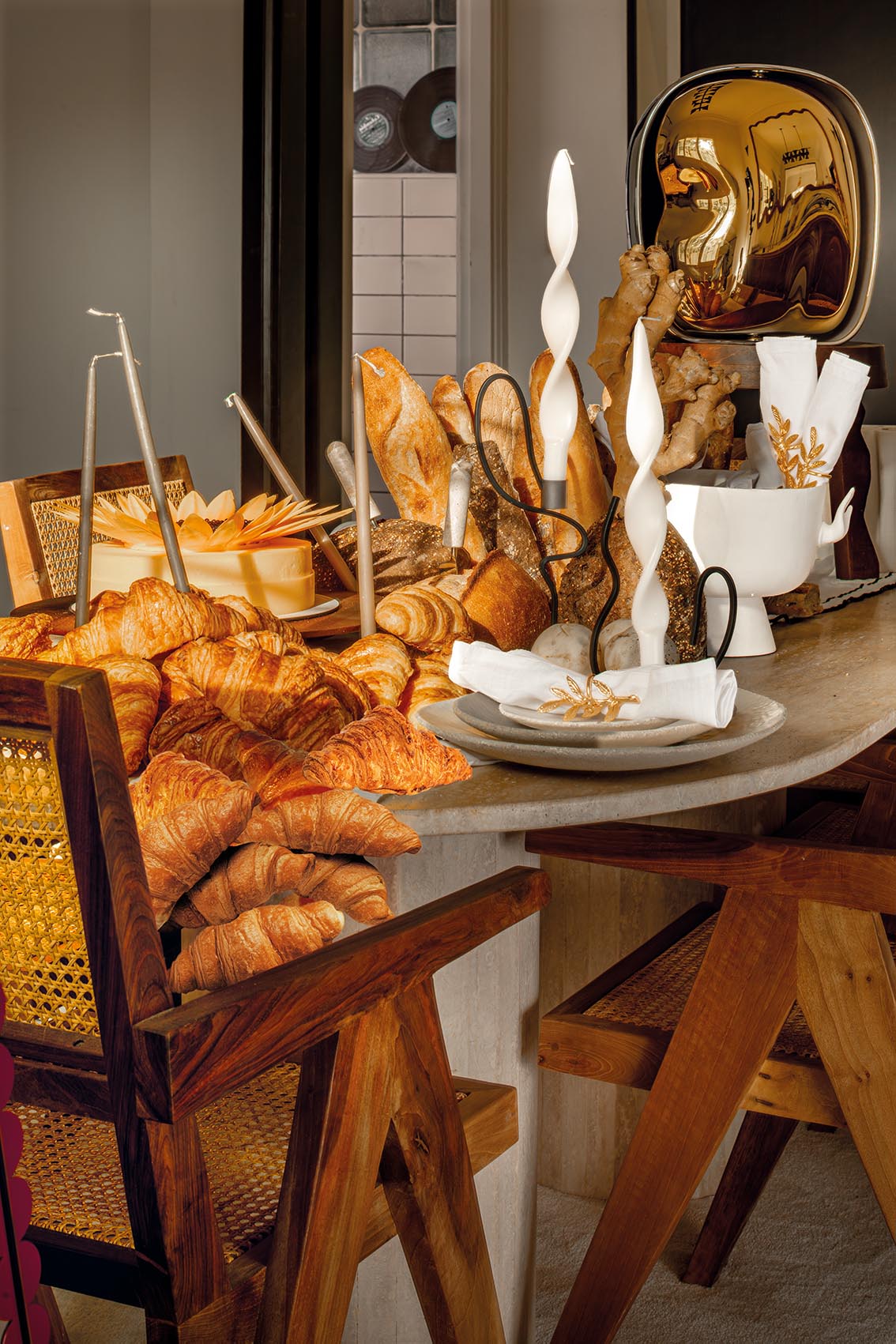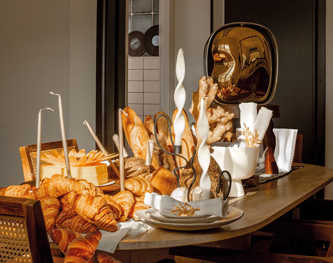 La fête simple, celle du matin partagé. L’abondance se lit dans le détail, dans la texture du pain, dans la lumière qui s’accroche aux dorures et aux porcelaines. Le métal poli répond au grain du bois, la blancheur de la vaisselle équilibre la chaleur des viennoiseries. Une célébration silencieuse, à la fois domestique et sculpturale, où la beauté se glisse dans le rythme du quotidien.