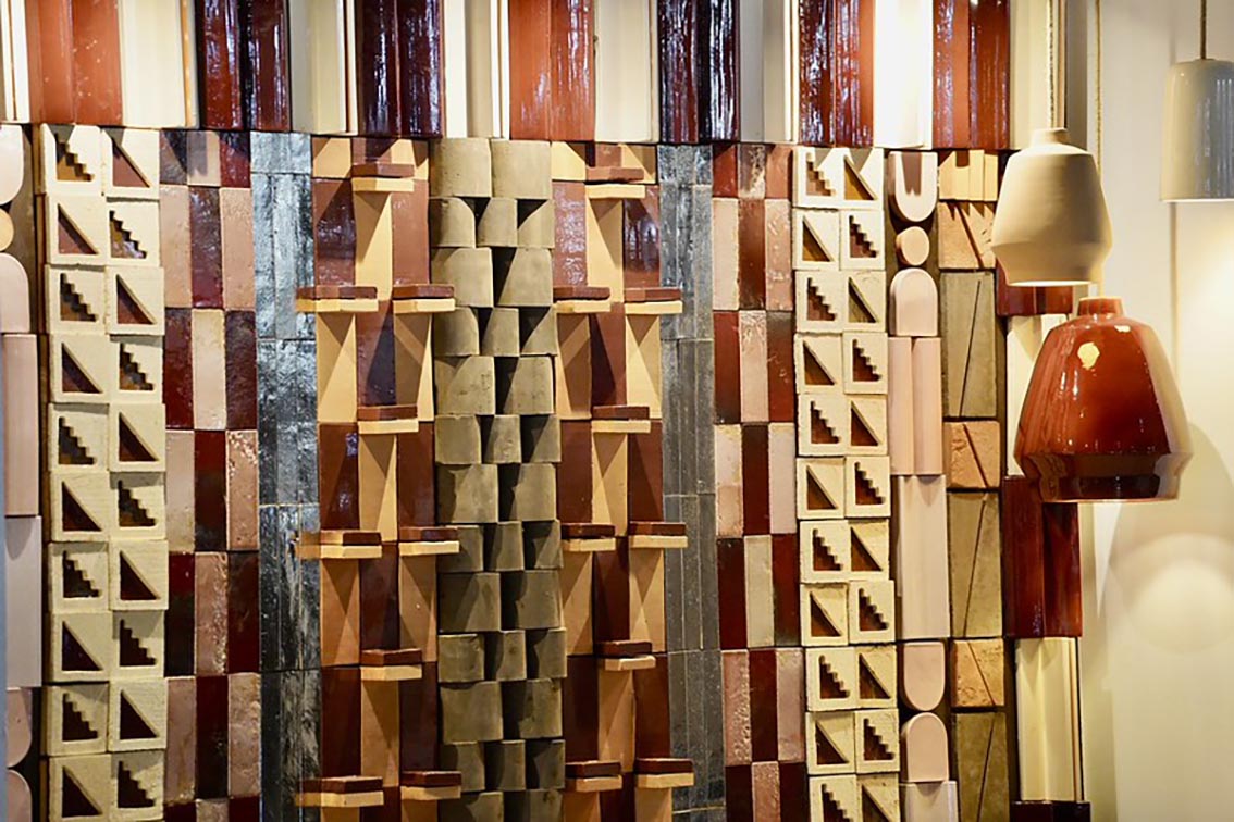 L’une des installations les plus remarquées fut celle dédiée aux coussins, suspendus comme des œuvres d’art sur fond de mur fleuri. Chaque pièce semblait exprimer un style et une culture, du tropical au graphique. À quelques pas, un mur de céramique artistique combinait couleurs chaudes et jeux de formes en relief, fusionnant artisanat traditionnel et design contemporain.