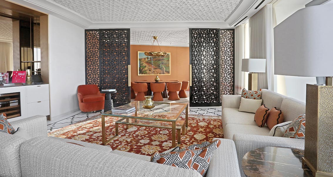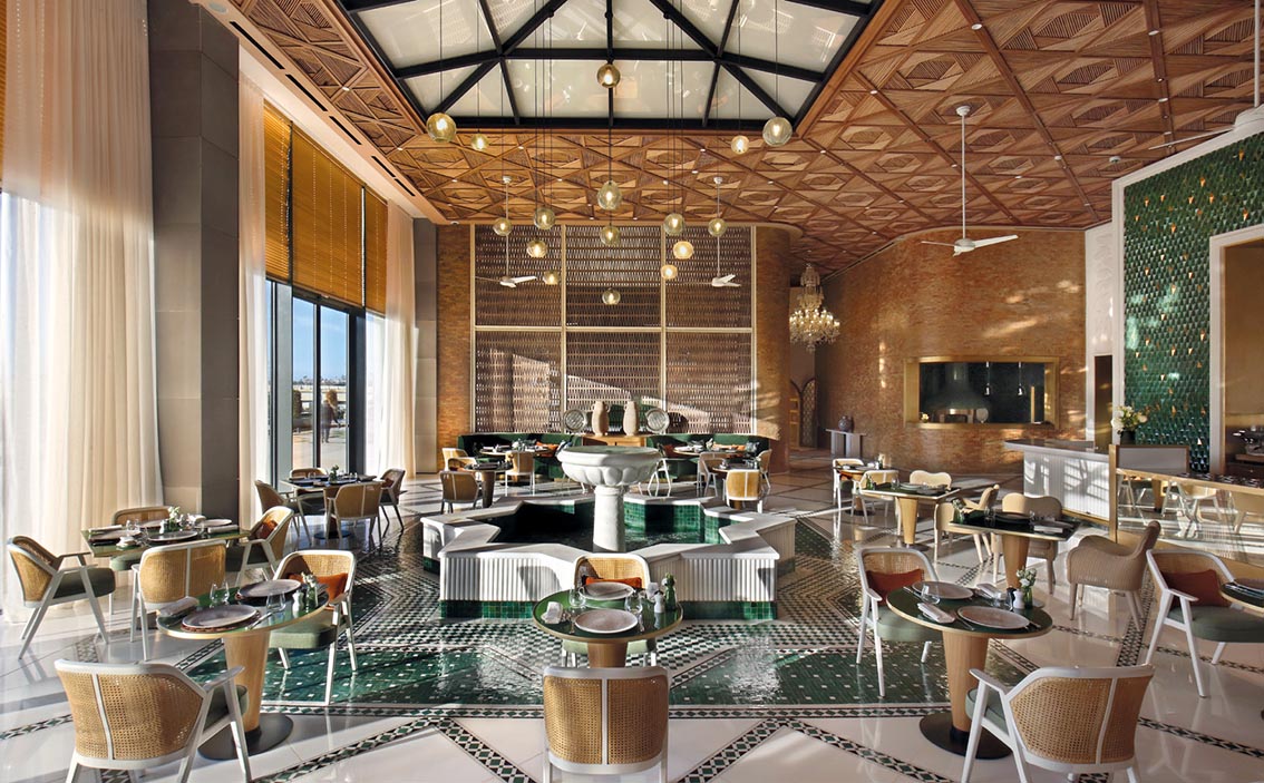 Du geste artisanal à la haute ingénierie, le projet repose sur une rencontre rare entre tradition et innovation. Sous la direction artistique du designer Pierre-Yves Rochon, artisans marocains et créateurs internationaux ont travaillé de concert pour donner naissance à des espaces où zellige, bois sculpté, cuivre ciselé et marbre dialoguent avec des lignes contemporaines.