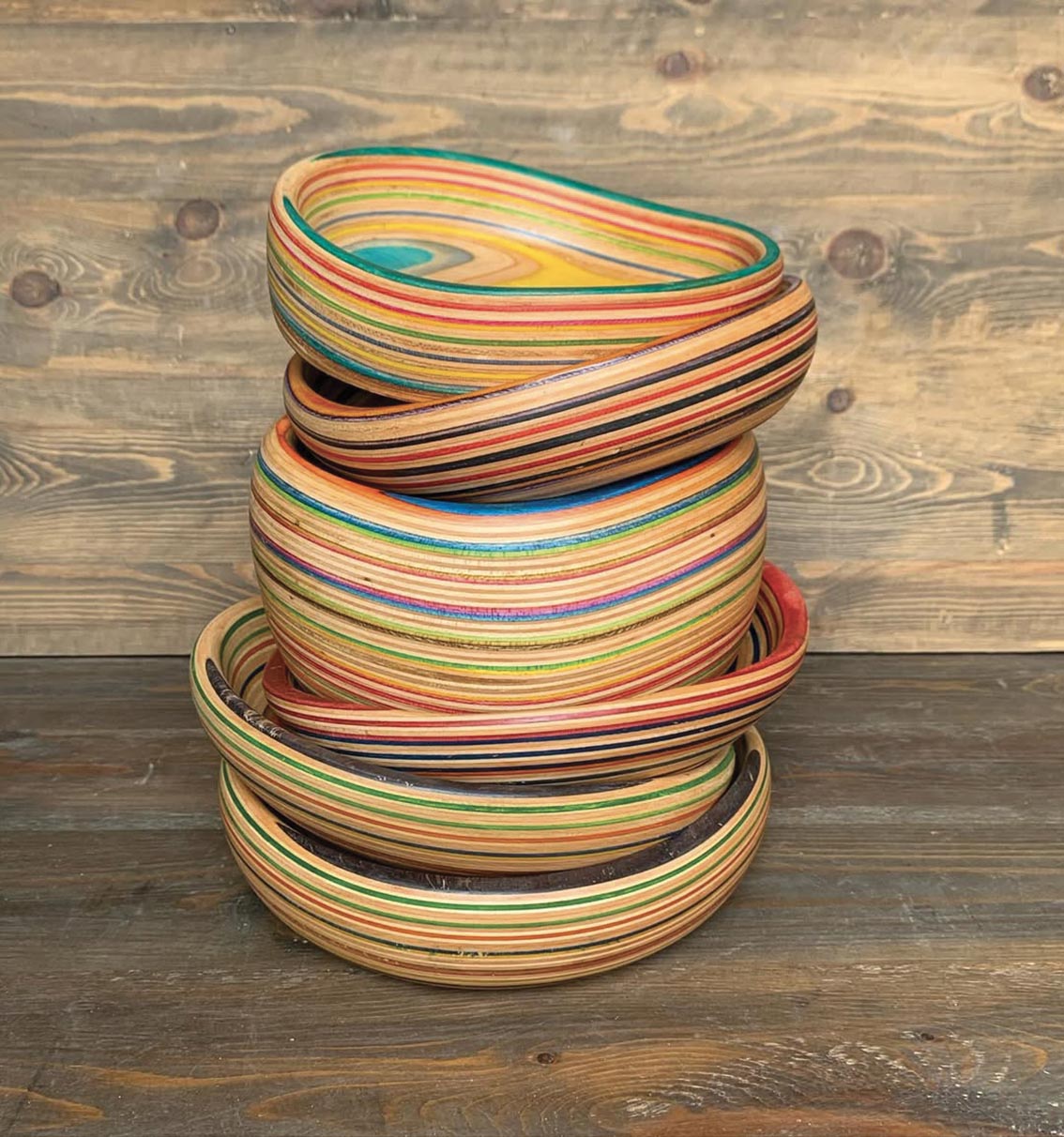 Rachid Recycleskate détourne l’objet urbain pour en faire matière critique. La planche de skateboard, usée par l’asphalte et saturée d’énergie cinétique, devient support d’une nouvelle esthétique. Le bois laminé, compressé en strates colorées, révèle à la découpe des géométries imprévues : cercles concentriques, surfaces vibratoires, éclats de pigments qui oscillent entre cartographie géologique et abstraction picturale. Ce qui naissait du choc et de la vitesse se fige dans la patience de l’atelier. Bols, horloges et pièces décoratives condensent ainsi une double mémoire, celle d’un geste urbain et celle d’une réinvention artisanale.