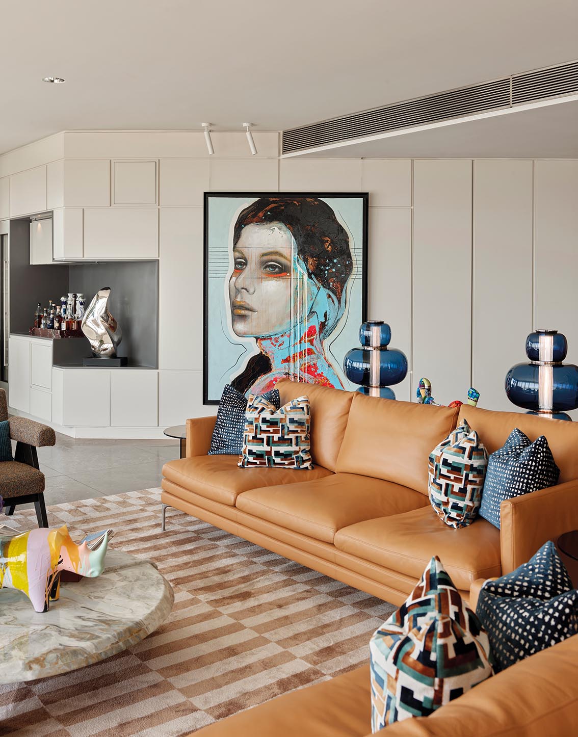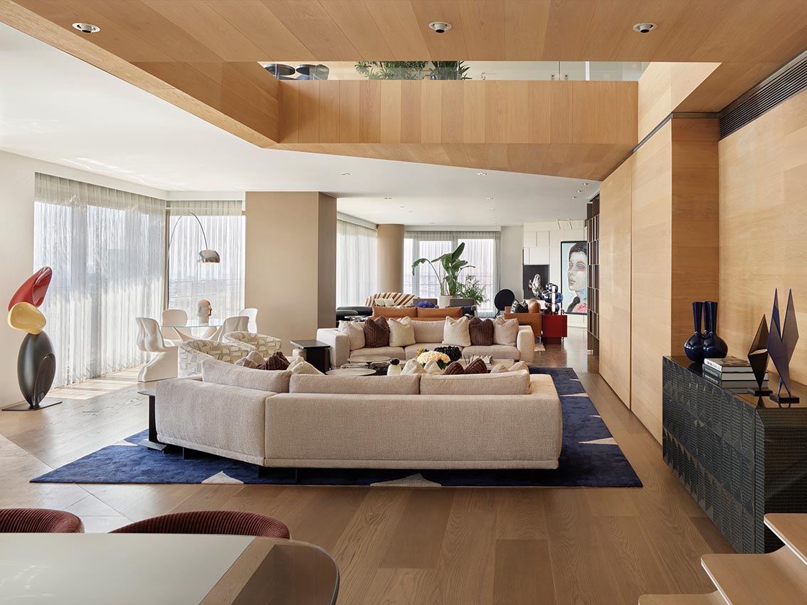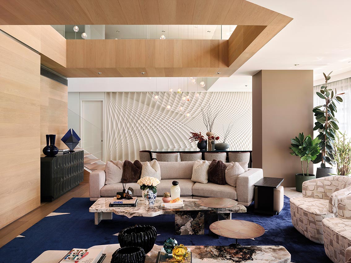 Le séjour fonctionne comme un cœur stable. Les assises basses, largement dimensionnées, s’installent dans l’axe du mur sculptural, traité comme une surface active plus que comme un fond décoratif. Ce mur n’est pas là pour attirer l’attention de façon spectaculaire ; il sert de contrepoint aux lignes horizontales dominantes et absorbe visuellement la profondeur de la pièce. Sa présence fait sens à cet endroit précis, car elle équilibre la générosité du volume sans l’alourdir.