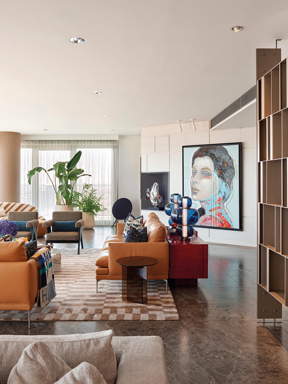 La palette chromatique renforce cette cohérence. Les tons neutres dominent et servent de base stable, tandis que les accents plus profonds interviennent de manière ciblée, souvent à travers le mobilier ou certaines œuvres. Ces choix chromatiques ne cherchent pas l’effet ; ils soutiennent la lecture des volumes et accompagnent la lumière naturelle, qui reste un élément central du projet.